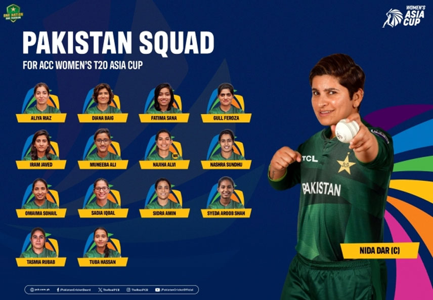 The Pakistan Cricket Board has announced the Green Shirts’ squad for the upcoming ACC Women’s T20 Asia Cup, beginning in Dambulla, Sri Lanka, on 19th of next month.Nida Dar has been retained as Pakistan captain for the Cup. The squad was confirmed following a four-day camp, which concluded in Karachi.Other members of the squad are - Aliya Riaz, Diana Baig, Fatima Sana, Gull Feroza, Iram Javed, Muneeba Ali, Najiha Alvi, Nashra Sundhu, Omaima Sohail, Sadia Iqbal, Sidra Amin, Syeda Aroob Shah, Tasmia Rubab and Tuba Hassan.Ayesha Zafar, Natalia Parvaiz, Rameen Shamim, Sadaf Shamas, Umm-e-Hani and Waheeda Akhtar, who were part of the 17-member squad that toured England last month, have been left out. Instead, the selectors have named Iram Javed, Omaima Sohail, Syeda Aroob Shah and Tasmia Rubab