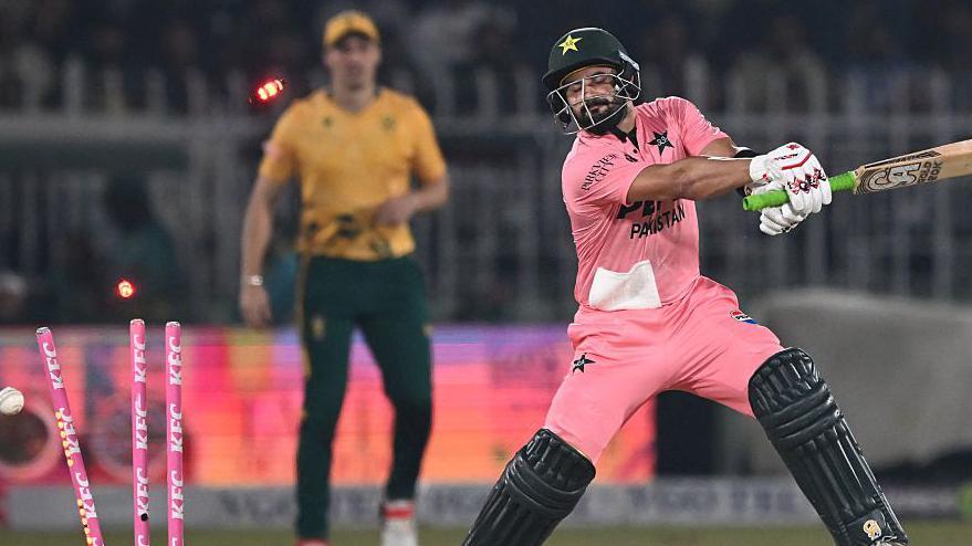 Getty Imagesاچھے آغاز کے بعد ولیمز کی ایک تیز گیند پر صاحبزادہ 24 رنز بنانے کے بعد بولڈ ہوگئےراولپنڈی میں پہلے ٹی ٹوئنٹی انٹرنیشنل میچ میں جنوبی افریقہ نے پاکستان کو 55 رنز سے شکست دی ہے۔ مہمان ٹیم نے 195 رنز کا ہدف دیا تھا جس کے جواب میں کریز پر پاکستانی بلے باز قدم نہ جما سکے۔ اوپنر صائم ایوب 37 رنز کے ساتھ پاکستان کے ٹاپ سکورر رہے جبکہ ٹی ٹوئنٹی ٹیم میں واپسی پر بابر اعظم صفر پر آؤٹ ہوئے۔جنوبی افریقہ کے بولر کوربن بوش نے چار جبکہ جارج لنڈے نے تین وکٹیں حاصل کیں۔جنوبی افریقہ کے ریضا ہینڈرکس نے پہلی اننگز میں 60 رنز کی باری کھیل کر اپنی ٹیم کی پوزیشن مضبوط کی تھی۔Getty Imagesٹی ٹوئنٹی ٹیم میں واپسی پر بابر اعظم صفر پر آؤٹ ہوئے بابر اعظم سمیت پاکستانی بلے بازوں کی مایوس کن کارکردگیاننگز کے آغاز میں اوپنرز صاحبزادہ فرحان اور صائم ایوب کے درمیان 31 رنز کی شراکت قائم ہوئی تھی مگر لیزاد ولیمز کی ایک تیز گیند پر صاحبزادہ 24 رنز بنانے کے بعد بولڈ ہوگئے۔میچ کا اہم لمحہ چھٹے اوور میں دیکھا گیا جب ٹی ٹوئنٹی ٹیم میں واپسی کرنے والے سابق کپتان بابر اعظم اپنی دوسری ہی گیند پر صفر رنز بنا کر کیچ آؤٹ ہوگئے۔ وہ بوش کی بولنگ پر جارحانہ شاٹ کھیلنا چاہتے تھے مگر ہینڈرکس کو آسان کیچ دے بیٹھے۔اس کے بعد بوش نے کپتان سلمان آغا کو ایل بی ڈبلیو کیا۔قانونی نوٹس پھاڑنے کے بعد ملتان سلطانز کے مالک علی ترین نے ’رنجشیں دور کرنے کے لیے‘ محسن نقوی کو خط لکھ دیانعمان علی: سانگھڑ کا ’فاسٹ بولر‘ جو پاکستان کے سپن اٹیک کا ’اٹوٹ انگ‘ بن گیاانڈین بلے باز شریاس ایئر کی ’تلی کی چوٹ‘ کتنی خطرناک ہے اور کیا اس عضو کے بغیر زندہ رہنا ممکن ہے؟ٹیسٹ کپتان شان مسعود کنسلٹنٹ انٹرنیشنل کرکٹ بھی مقرر: ’پاکستانی کرکٹ میں کچھ بھی ہو سکتا ہے‘چوتھی وکٹ کے لیے صائم اور عثمان خان کے درمیان 39 رنز کی شراکت قائم ہوئی۔ اس کے بعد صائم 37 رنز بنا کر سپنر لنڈے کا شکار بنے۔ اس کے بعد دو اوورز میں عثمان خان (12)، حسن نواز (3) اور فہیم اشرف (1) کی وکٹیں بھی گِر گئیں۔نویں وکٹ کے لیے محمد نواز اور شاہین آفریدی کے درمیان 20 رنز کی شراکت قائم ہوئی۔ پھر شاہین بوش کا تیسرا شکار بنے۔ نسیم شاہ کو بھی بوش نے ہی آؤٹ کیا۔ آخری وکٹ محمد نواز کی گِری جو 36 رنز بنا کر ویلمز میں شکار بنے۔ Getty Imagesجنوبی افریقہ کے ریضا ہینڈرکس نے 60 رنز کی باری کھیل کر اپنی ٹیم کی پوزیشن مضبوط کی تھینو وکٹیں گِرنے کے باوجود جنوبی افریقہ کی جارحانہ بیٹنگپاکستان کے کپتان سلمان آغا نے ٹاس جیت کر پہلے بولنگ کا فیصلہ کیا تھا۔جنوبی افریقہ کے بلے بازوں کا آغاز جارحانہ تھا اور انھوں نے وکٹیں گنوانے کے باوجود پوری اننگز کے دوران رن ریٹ بڑھائے رکھا۔پاکستان کو پہلی کامیابی چوتھے اوور میں ملی۔ صائم ایوب کی گیند پر کوئنٹن ڈیکاک کیچ آؤٹ ہوئے۔ ڈیکاک نے پانچ چوکوں کی مدد سے 13 گیندوں پر 23 رنز بنائے تھے۔ٹونی زی زورزی 16 گیندوں پر 33 رنز بنا کر محمد نواز کا پہلا شکار بنے۔ پھر نواز نے ڈیوالڈ بریوس کو بولڈ کیا۔ 11ویں اوور میں پاکستان کو چوتھی وکٹ ملی جب صائم ایوب کی گیند پر میتھیو بریٹزکے کیچ آؤٹ ہوئے۔محمد نواز نے اپنے سپیل کی آخری گیند پر جنوبی افریقہ کے کپتان ڈوناون فریرا کو بولڈ کیا۔پھر ابرار احمد نے اوپنر ریضا ہینڈرکس کی وکٹ حاصل کی جنھوں نے 60 رنز کی باری کھیلی تھی۔ نسیم شاہ نے 36 رنز بنانے والے جارج لنڈے کو آؤٹ کیا۔ کوربن بوش شاہین آفریدی کا شکار بنے اور لیزاد ولیمز رن آؤٹ ہوئے۔یوں جنوبی افریقہ نے 20 اوورز میں نو وکٹوں کے نقصان پر 194 رنز بنائے۔قانونی نوٹس پھاڑنے کے بعد ملتان سلطانز کے مالک علی ترین نے ’رنجشیں دور کرنے کے لیے‘ محسن نقوی کو خط لکھ دیاانڈین بلے باز شریاس ایئر کی ’تلی کی چوٹ‘ کتنی خطرناک ہے اور کیا اس عضو کے بغیر زندہ رہنا ممکن ہے؟ٹیسٹ کپتان شان مسعود کنسلٹنٹ انٹرنیشنل کرکٹ بھی مقرر: ’پاکستانی کرکٹ میں کچھ بھی ہو سکتا ہے‘نعمان علی: سانگھڑ کا ’فاسٹ بولر‘ جو پاکستان کے سپن اٹیک کا ’اٹوٹ انگ‘ بن گیاشبھمن گل سے مصافحے 